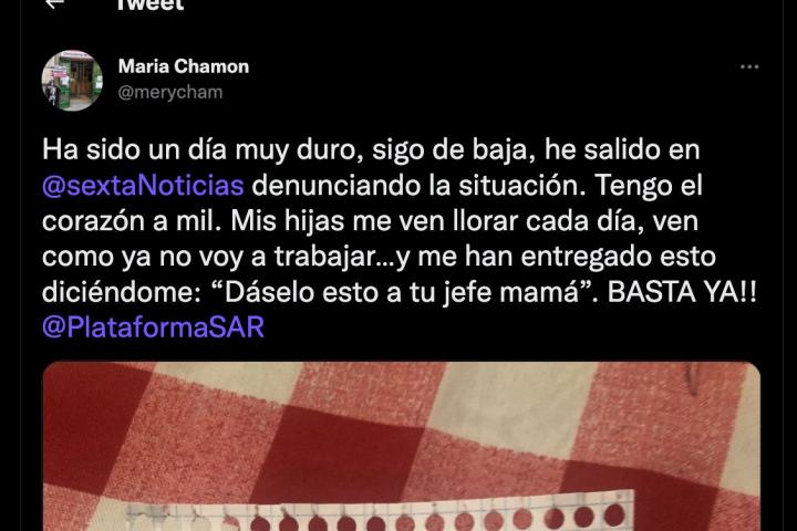 A continuación, ha aclarado el significado de la fotografía publicada. Se trata de una hoja de papel con un mensaje: “Mis hijas me ven llorar cada día, ven como ya no voy a trabajar… y me han entregado esto diciéndome: “Dáselo esto a tu jefe mamá””.