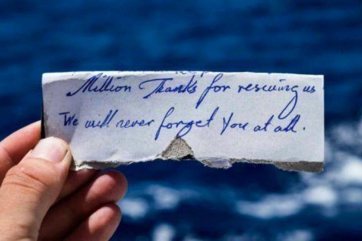 Humanidad y agradecimiento. No hace falta más que eso para hacer que fluya la emoción, a borbotones. Algo extraño, mezcla de dolor y alegría, es lo que está recorriendo estos días las redes sociales gracias al tuit que ha publicado Óscar Camps, fundador de la ONG Proactiva Open Arms, en el que da fe de un humilde mensaje dejado por uno de los inmigrantes y refugiados que cada día se juegan la vida cruzando el Mar Mediterráneo rumbo a la Europa de las oportunidades y las fronteras cerradas.