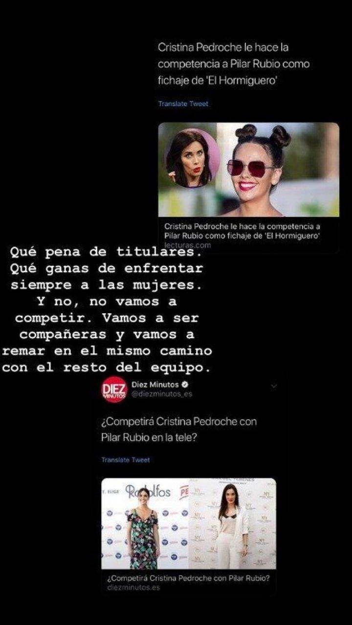 “Qué pena de titulares. Qué ganas de enfrentar siempre a las mujeres. Y no, no vamos a competir. Vamos a ser compañeras y vamos a remar en el mismo camino con el resto del equipo”, se ha quejado Pedroche tanto en su cuenta de Twitter como en Instagram.