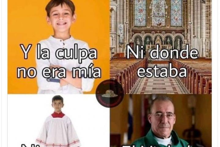 En la fotografía, dividida en cuatro, se pueden ver la fotografía de un niño, de una iglesia, de un monaguillo y de un sacerdote y, sobre ellos, el estribillo de Un violador en tu camino, de tal modo que la parte de “el violador eres tú” recae sobre el prelado.
