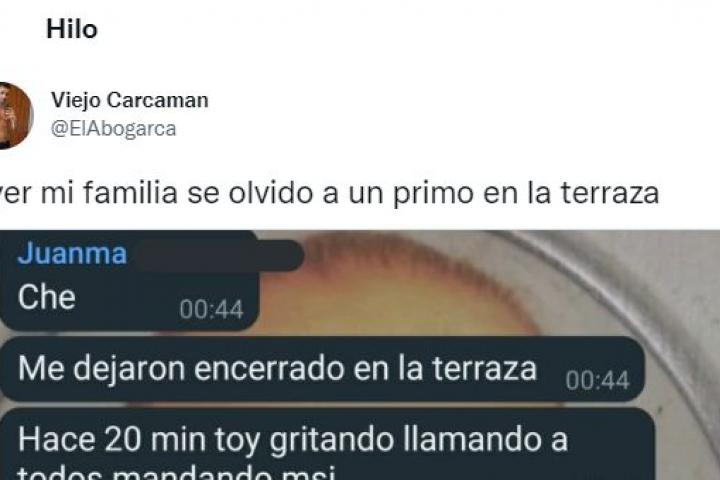 La anécdota fue compartida en Twitter por su primo Antonio que, aunque no pudo pasar con ellos la Navidad, siguió la historia a través del grupo de WhatsApp de la familia. “Ayer mi familia se olvidó a un primo en la terraza”, comentaba junto con una captura de pantalla de la conversación de WhatsApp con su primo.
