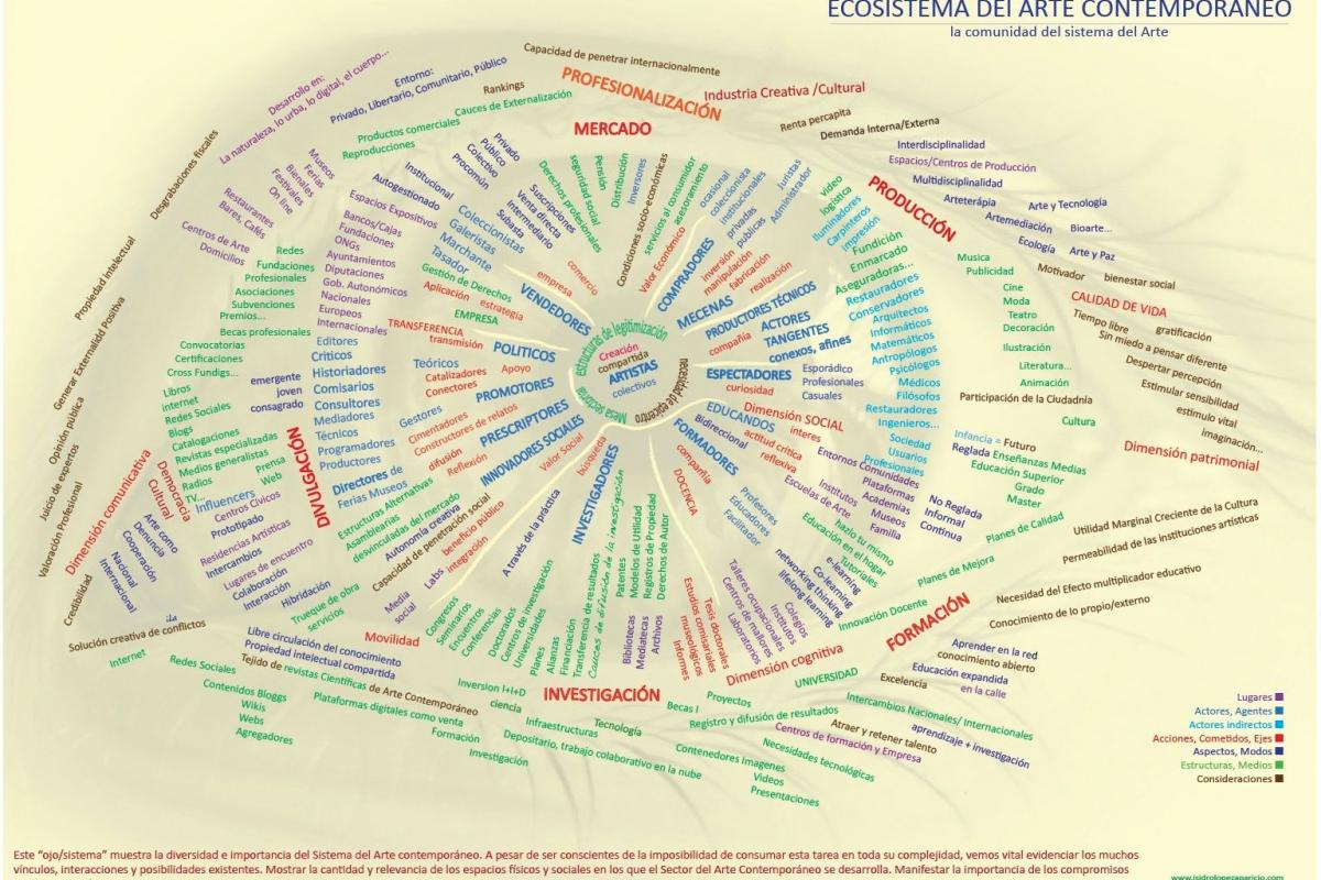 A principios de 2010, cuando elaboré la infografía que representa la complejidad de este ecosistema del arte —hasta el momento inexistente—, pretendí mostrar visualmente esta característica poliédrica que define al sector del arte, donde conviven tanto espacios como agentes de una enorme diversidad. El incorporar el prefijo “eco” y representarlo con una imagen tenía una intención reivindicativa para defender a todo el colectivo, al tiempo que posicionaba en el centro a la creación.