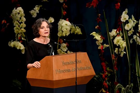 Siri Hustvedt se dirige al público concentrado en Oviedo.