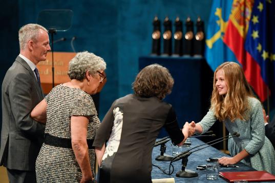 Joanne Chory y Sandra Myrna Diaz, saludando a la princesa Leonor.