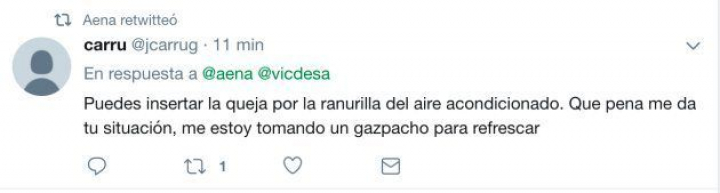 Y, hasta ahí, todo normal. Lo extraño sucedió este jueves, cuando un usuario llamado Carru respondió al primero con muy mala baba: "Puedes insertar la queja por la ranurilla del aire acondicionado. Que pena me da tu situación, me estoy tomando un gazpacho para refrescar".