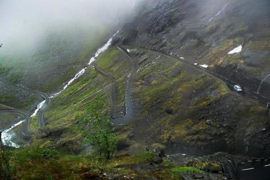 La Trollsrigen es la carretera que une Andalsnes con Valldal. Tiene 11 curvas de 180º que, si las sorteas con cuidado, tienen premio: las vistas del valle desde un mirador y la cascada Stigfossen, de 320 metros de caída de agua.