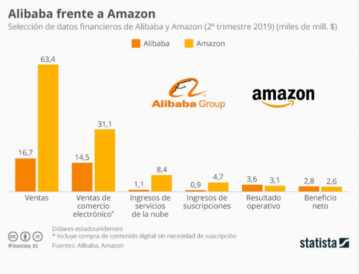Esta infografía de Statista muestra que, aunque el volumen de ventas de Amazon es casi cuatro veces superior al de Alibaba (63.400 millones en el segundo trimestre de 2019 frente a 16.700 de Alibaba), el beneficio neto del segundo es ligeramente superior.