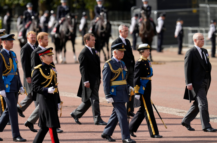 En primera fila caminando detrás del féretro se han colocado el rey Carlos III y sus hermanos, la princesa Ana y los príncipes Andrés y Eduardo. En la siguiente fila iban los príncipes Guillermo y Harry, junto a su primo Peter Philips. Al contrario que en el funeral de su abuelo, Felipe de Edimburgo, los hermanos han caminado juntos.