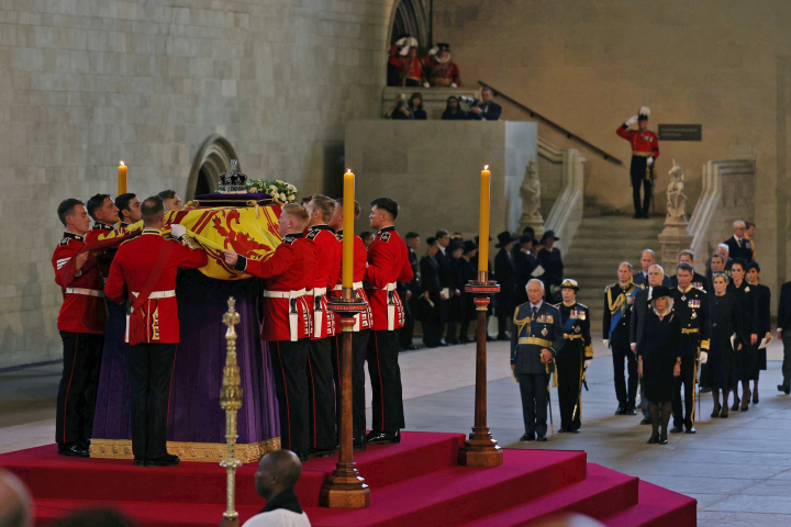 El ataúd, cubierto con el estandarte real, la corona imperial, el orbe real y el cetro de oro permanecerá custodiado por la guardia real mientras los ciudadanos se despiden de la reina.