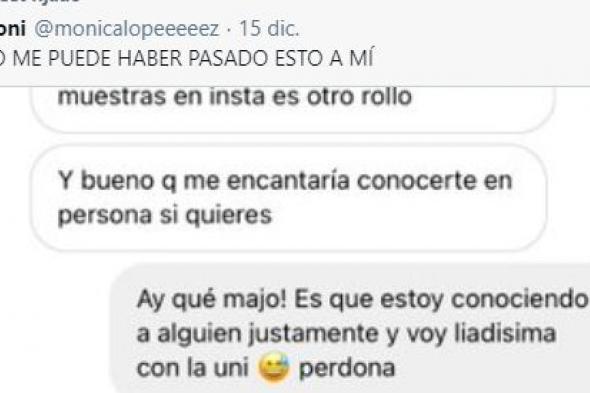 ″No, perdóname tú. Estaba practicando para decírselo a la chica que me gusta y veo que no funciona. Gracias por tu ayuda”, le contestó. Mónica ha reaccionado en su perfil de Twitter junto a la captura con el siguiente mensaje: “No me puede estar pasando esto a mí”.
