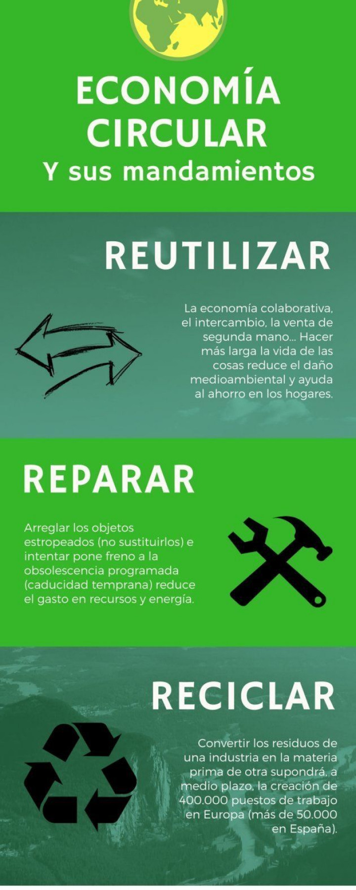 Se trata de un nuevo paradigma económico —y social— que plantea reducir el uso de materias primas y de energía, reutilizar los recursos y reciclar los residuos.