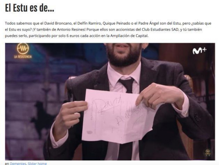 Antonio Resines ha hecho accionista del Estudiantes a David Broncano. El popular actor y colaborador del programa ha aprovechado los Reyes Magos y la ampliación de capital en la que está inmerso el club madrileño para hacerse con 14 acciones en nombre de Broncano. La suma total, como ha desvelado, está valorada en 84 euros.