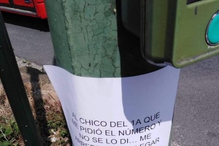“Al chico del 1A que me pidió el número y no se lo di... me arrepentí al llegar a casa. Si aún lo quieres, vente un día a la hora que siempre llegamos en bus. Quiero ese número”, se lee en el cartel.