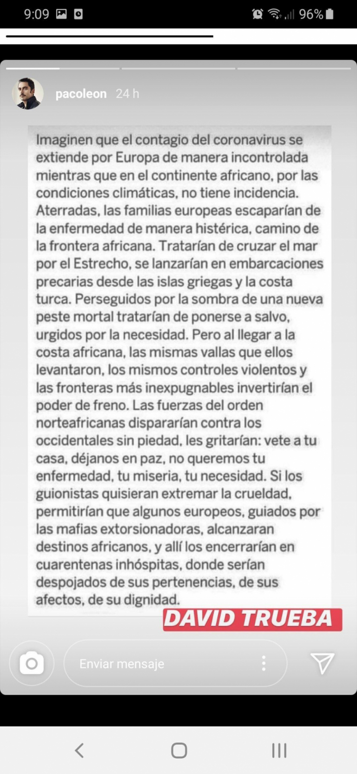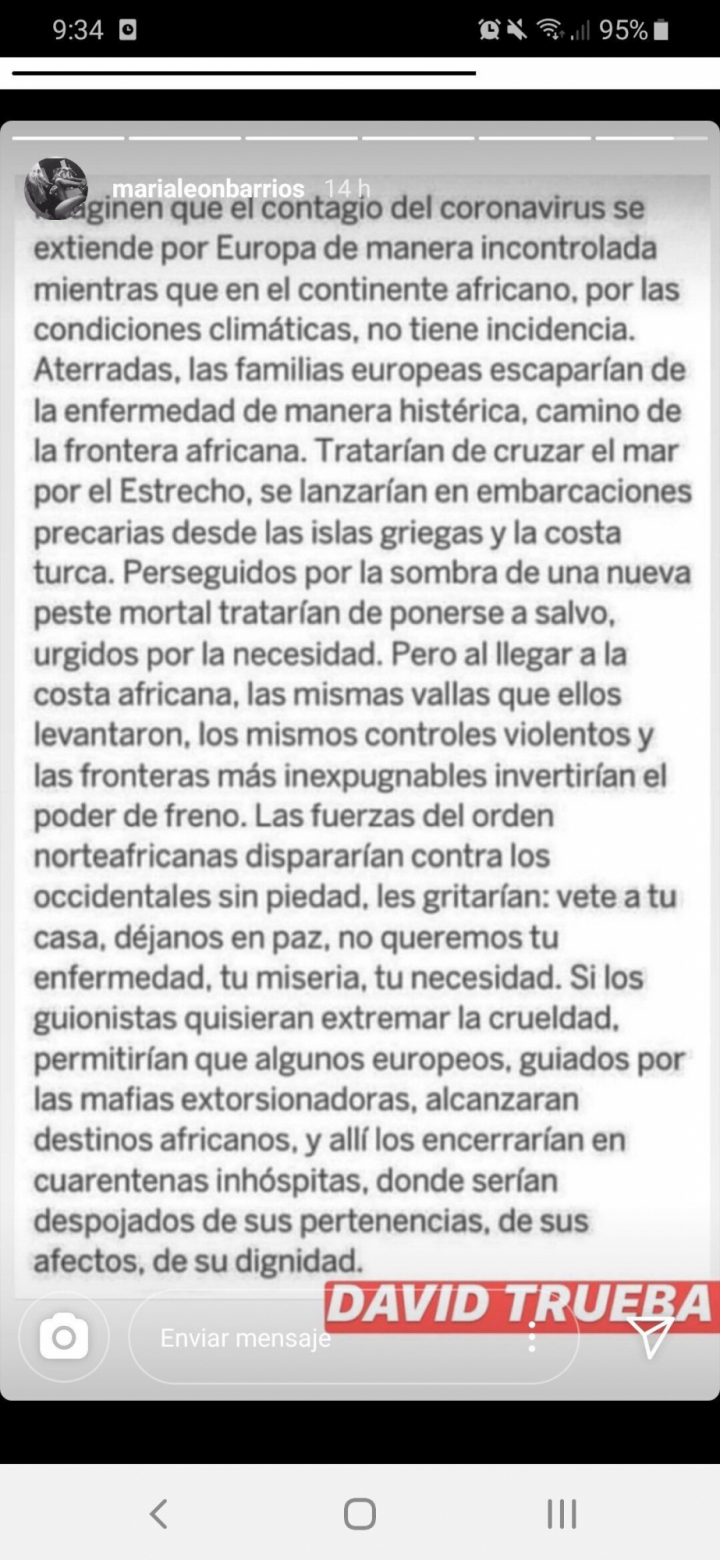 De hecho, una de las historias más compartidas y que seguro que has visto en Instagram corre a cargo de David Trueba. El cineasta publicó este martes en El País una columna llamada La distopía nuestra de cada día y en ella plantea un paralelismo entre el drama migratorio vivido hace unos días en la frontera entre Grecia y Turquía. Una distopía que parece sacada de una serie de Netflix o HBO, pero que podría ser real.