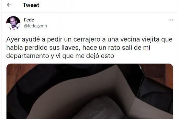 El usuario de Twitter @fedegzmn ha conmovido a decenas de miles de personas en esa red social al compartir el gesto de agradecimiento que ha tenido una vecina con él.