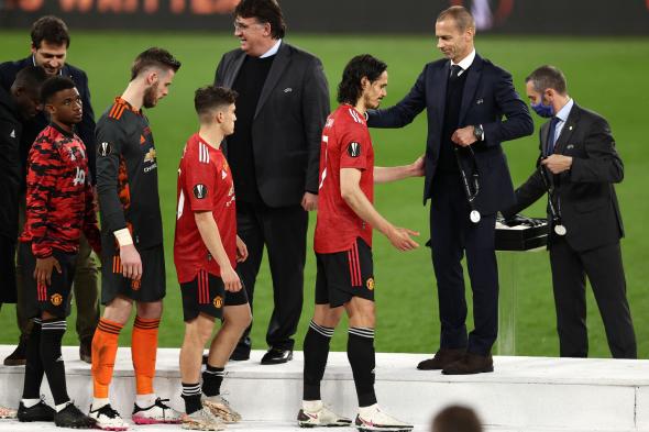 En las imágenes se ve cómo los dos futbolistas españoles del Manchester United, David de Gea y Juan Mata, permanecen con las medallas colgadas al menos en un primer momento.