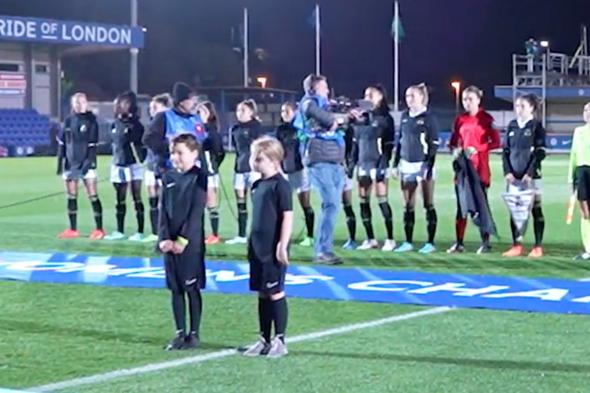 Mientras sonaban los himnos antes del encuentro, en el que el conjunto madridista cayó 2-0 en el estadio de Kingsmeadow, dos niños se encontraban en el centro del campo siguiendo el protocolo mientras las jugadoras madridistas permanecían detrás de ellos.