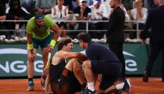 Primero se ha retirado de la Philippe Chatrier en silla de ruedas y al rato ha reaparecido en pista apoyado en dos muletas. Hasta la lesión del alemán, los dos tenistas habían dejado una clase maestra de tenis de más de tres horas muy igualado: 7-6 y 6-6.