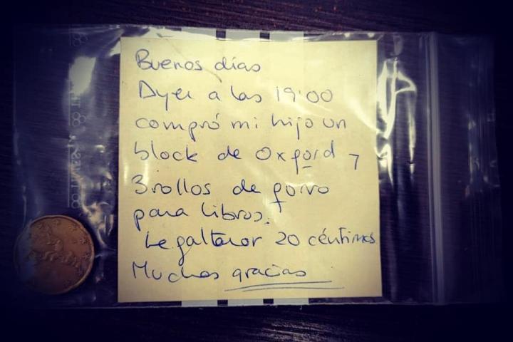 “Buenos días, ayer sobre las 19: compró mi hijo un block de Oxford y tres rollos de forro para los libros. Le faltaba 20 céntimos. Muchas gracias”, escribió el cliente en la nota.
