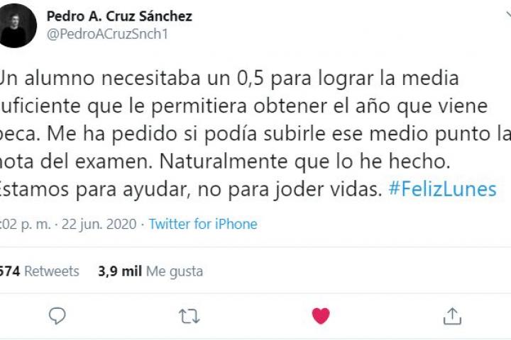 “Un alumno necesitaba un 0,5 para lograr la media suficiente que le permitiera obtener el año que viene beca. Me ha pedido si podía subirle ese medio punto la nota del examen. Naturalmente que lo he hecho. Estamos para ayudar, no para joder vidas”, ha escrito Pedro A. Cruz Sánchez en su cuenta de Twitter.