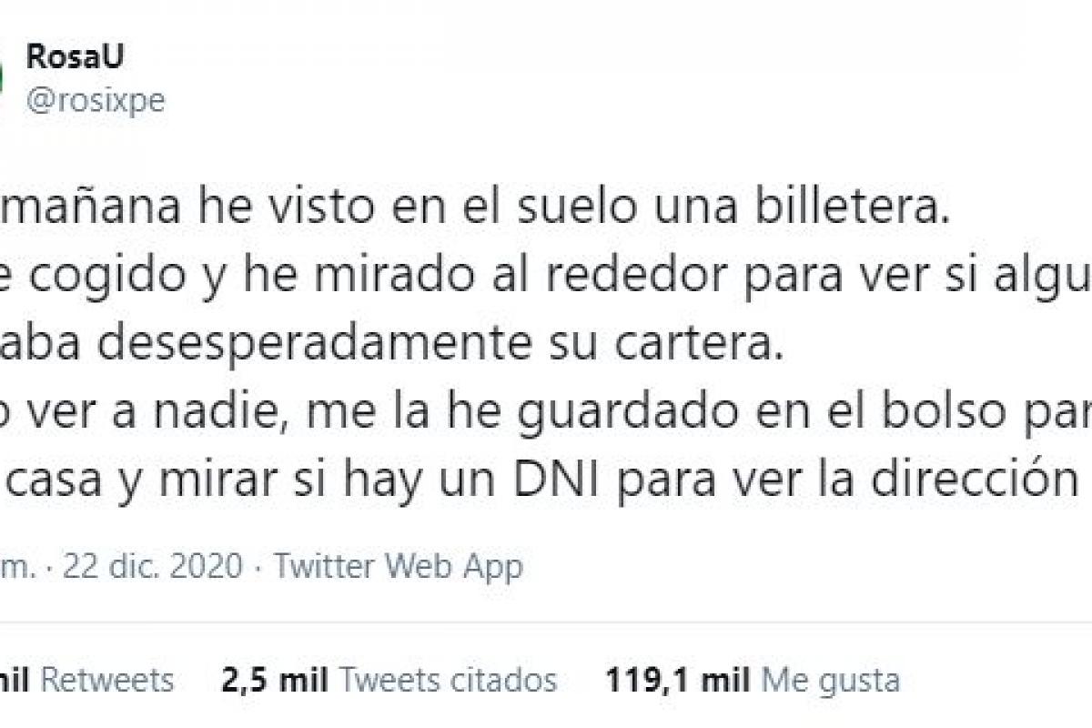 Una historia para volver a creer en el ser humano. Rosa, una tuitera, ha emocionado a toda la red social del pajarito al contar lo que le ha pasado. En poco más de un día ya supera los 120.000 me gusta.