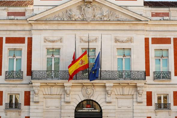 La imagen de las banderas de España y de la UE a media asta han sido muy comentadas en las redes, donde Ayuso está siendo acusada de incumplir las normas e invadir competencias.