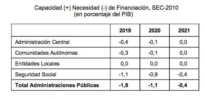 El objetivo se situará en el 1,1% para el año 2020 (frente al 0,5% previsto anteriormente) y en el 0,4% para el año 2021 (en lugar del superávit del 0,1% previsto antes).