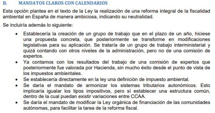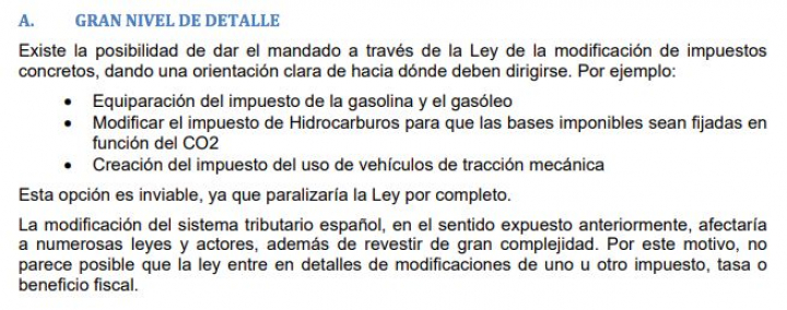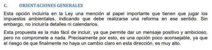 Debido a la complejidad que supone llevar a cabo una reforma fiscal dentro de una ley de cambio climático, debido a las "reticencias que existen desde Hacienda", el documento plantea tres posibilidades: