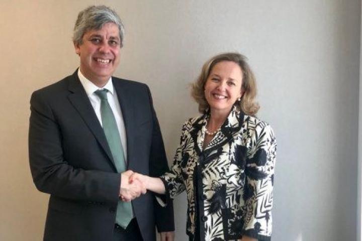 La ministra de Economía, Nadia Calviño, con el presidente del Eurogrupo, Mario Centeno.Mario Centeno (Twitter)