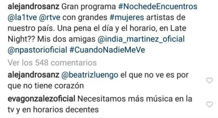 "Gran programa #NochedeEncuentros@la1tve@rtve con grandes #mujeres artistas de nuestro país. Una pena el día y el horario, en Late Night??", escribió Sanz en Instagram, donde compartió además un vídeo de Niña Pastori e India Martínez interpretando una de sus canciones, cuando nadie me ve.