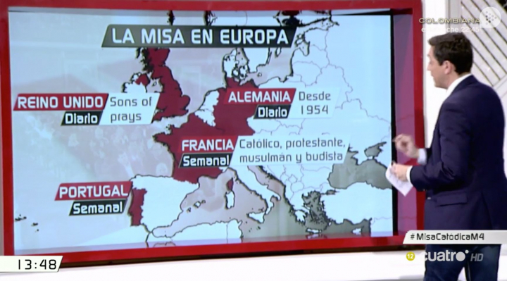 El presentador de Cuatro Javier Ruíz ha mostrado un gráfico, en su programa Las mañanas de Cuatro, en el que muestra como en los países del entorno de España la misa es un servicio público, con emisiones semanales en Portugal y Francia, y diarias en Alemania y Reino Unido.