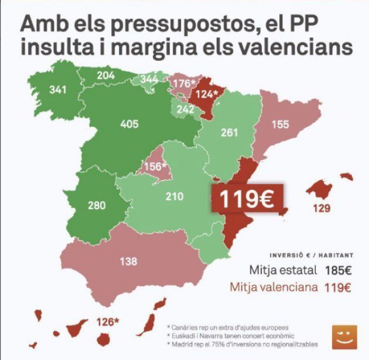 Nunca llueve a gusto de todos. Y menos en cuestión de dinero. La población valenciana está enfadada por el reparto de los Presupuestos Generales presentado este martes por el ministro de Hacienda, Cristóbal Montoro. Unos datos indignantes para Compromís, que ha hecho un gráfico con la inversión media por habitante.