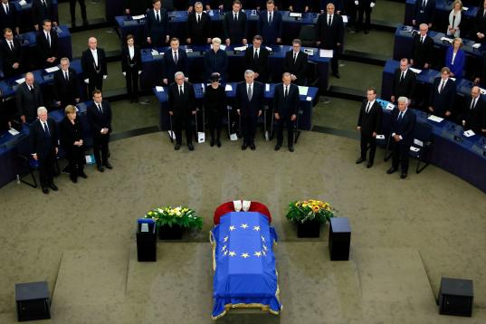Con líderes mundiales sentados en los escaños que normalmente ocupan los eurodiputados en la sede de la Eurocámara, y con el féretro de Kohl cubierto por una bandera europea y el colofón final del himno de la Alegría, el artífice de la integración europea tuvo su final deseado en la Alsacia, la región fronteriza entre Francia y Alemania que simboliza la reconciliación y el sueño continental.