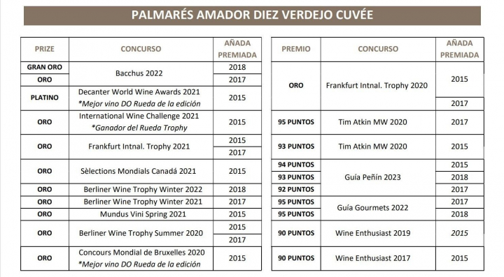 La última añada en llegar al mercado —Amador Diez Verdejo Cuvée 2018, que fue presentado de forma oficial recientemente en el salón profesional Prowein 2022— se ha estrenado entrando por la puerta grande, al obtener una medalla de Gran Oro en los premios ‘Bacchus 2022’ y al ser puntuado con 93 puntos Peñín y 95 puntos Gourmets en las últimas ediciones de estas guías, de importante poder prescriptor.