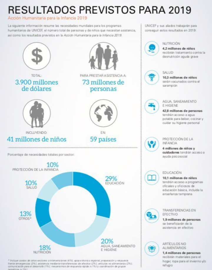 En su llamamiento para el presente año, al menos, ansían lograr dinero para dar apoyo psicosocial a cuatro millones de niños, educación básica para 10,1 millones más, la inmunización con vacunas contra el sarampión de 10,3 millones o el tratamiento de 4,2 millones de menores con desnutrición aguda grave.