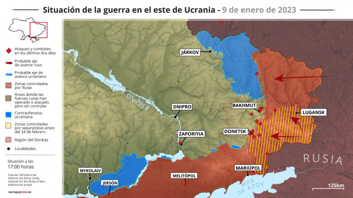 La ciudad ucraniana de Soledar, al norte de Bajmut, habría sido tomada por el grupo de mercenarios Wagner después de intensas batallas en los últimos días, según ha informado el empresario ruso y fundador de la organización paramilitar, Yevgueni Prigozhin. Ucrania, sin embargo, ha negado que el control ruso de la zona sea total.