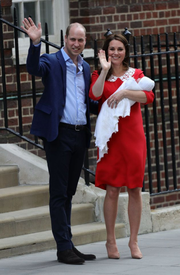 Siete horas después del nacimiento del tercer hijo del príncipe Guillermo y Catalina de Cambridge la pareja posó para la prensa en las escaleras del hospital St Mary's de Londres antes de regresar al Palacio de Kensington.