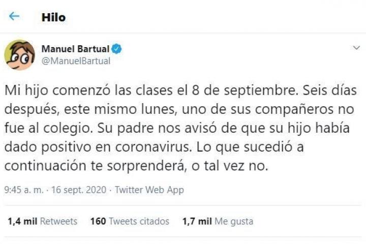 El guionista Manuel Bartual, autor de algunos de los hilos de Twitter más virales de los últimos años, ha denunciado en esa red social lo que está ocurriendo en la clase de su hijo. Su relato deja en evidencia el caos que se está viviendo en la vuelta al cole en muchos lugares de España.