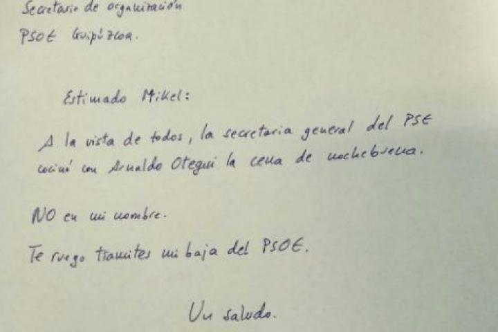 En la misiva, Múgica arranca señalando "A la vista de todos, la secretaria general del PSE cocinó con Arnaldo Otegi la cena de Nochebuena". Y escribe en mayúscula: "NO en mi nombre". Por lo tanto, agrega: "Te ruego tramites mi baja del PSOE". La carta está data en San Sebastián a 26 de diciembre.