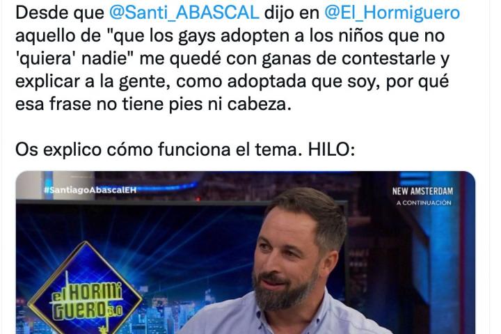 La autora del hilo, que reconoce en su biografía que suele hablar de adopción en su perfil de Twitter, se ha hecho eco de lo que dijo precisamente sobre este tema Abascal. Un grupo de tuits que tienen en poco más de seis horas más de 1.500 retuits y más de 2.600 ‘me gusta’.