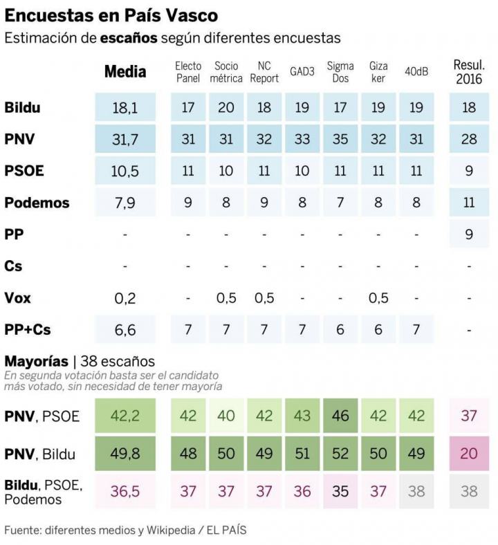 En el País Vasco, el CIS acertó la victoria del PNV. La previsión del instituto fue de hasta 34 parlamentarios para los peneuvistas que finalmente se hicieron con 31. Pero el barómetro erró con los socialistas, a quienes dio entre 11 y 13 diputados, porque el PSE-EE se hizo con 10. También falló el pronóstico con EH Bildu. El CIS otorgó entre 16 y 18 escaños a la izquierda abertzale, pero el resultado fue superior: 22.