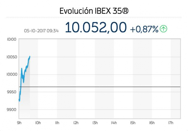 El Ibex 35, principal indicador de la Bolsa española, opta por las ganancias tras la apertura y rebota un 0,45 %, con lo que vuelve a conquistar los 10.000 puntos, un nivel que perdió ayer por las tensiones con Cataluña.