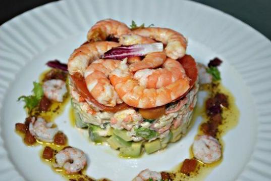 Los ingredientes son langostinos, gambas, aguacate, zanahoria rallada, lechugas varias, tomate, palitos de cangrejo, cebolla caramelizada y pan frito. Para preparar la vinagreta se necesita salsa golf, nata de cocinar, aceite de oliva, vinagre d...