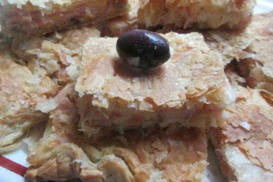 Se prepara con masa de hojaldre, jamón cocido, queso en lonchas, aceitunas verdes y negras, y huevos. Aquí tienes la receta completa.