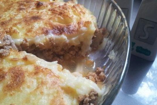 Los ingredientes son carne picada, patatas, cebolla, queso rallado y tomate concentrado. Puedes seguir aquí la receta.