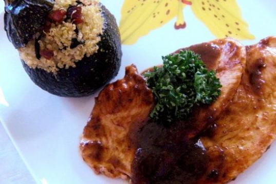 Acompañados de calabacines rellenos de quinoa. Puedes leer la receta en Cookpad.