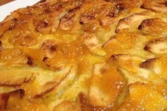 Con manzanas golden, leche, harina, azúcar, huevos y mermelada de melocotón. La receta está en Cookpad.