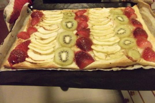 Las frutas son manzanas golden, kiwi, fresas y ciruelas en forma de mermelada. Puedes leer aquí la receta.
