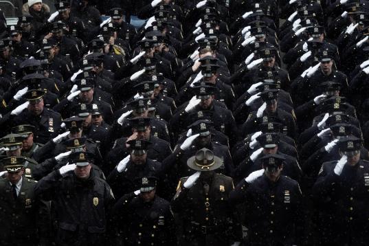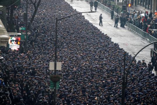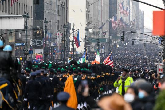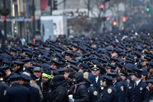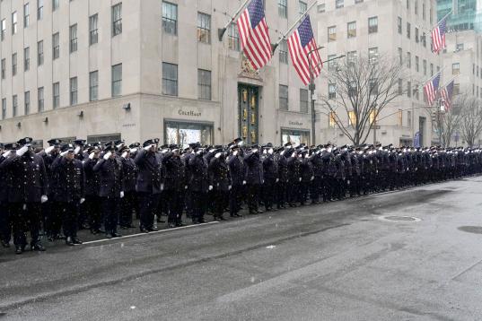 Miles de agentes de la Policía de Nueva York tomaron la Quinta Avenida, donde se les unieron miembros de la DEA (departamento antidrogas), la Academia de Policía y los Rangers.