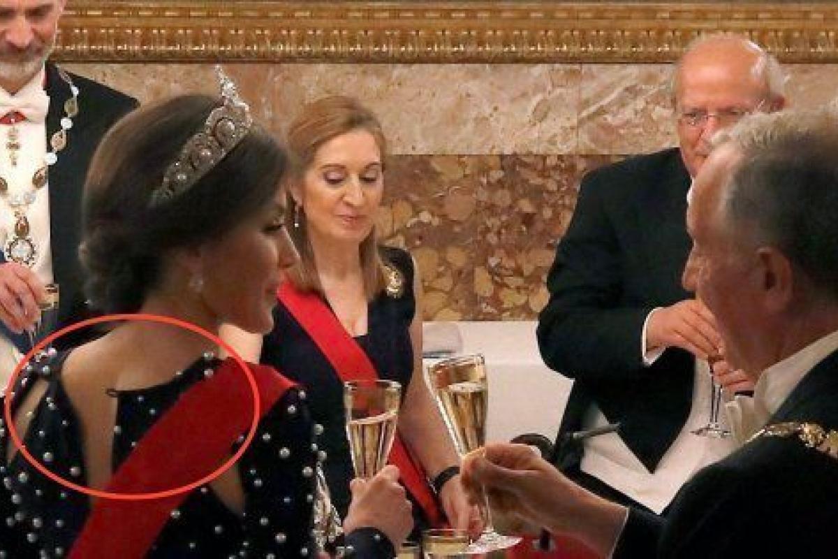 Durante un momento de la cena, a Doña Letizia se le desabrochó el botón de la espalda y tuvo que solicitar la ayuda de una camarera para arreglar el percance.